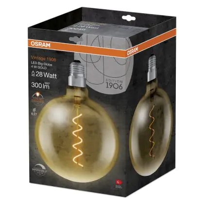 This Osram Vintage 1906 LED bulb is practical and stylish. It has the popular E27 (Edison screw) cap/base. It's globe shaped and has a transparent gold finish that shows off the decorative LED filament inside. It's perfect for adding a cosy atmosphere to any environment and because it's dimmable, you've got ultimate control.